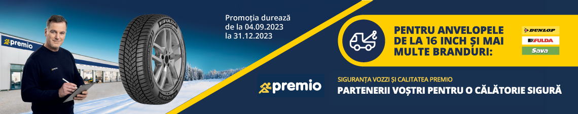 Vizitați magazinul Premio și cumpărați un set de anvelope Dunlop/Fulda/Sava de 16’’ sau mai mari.